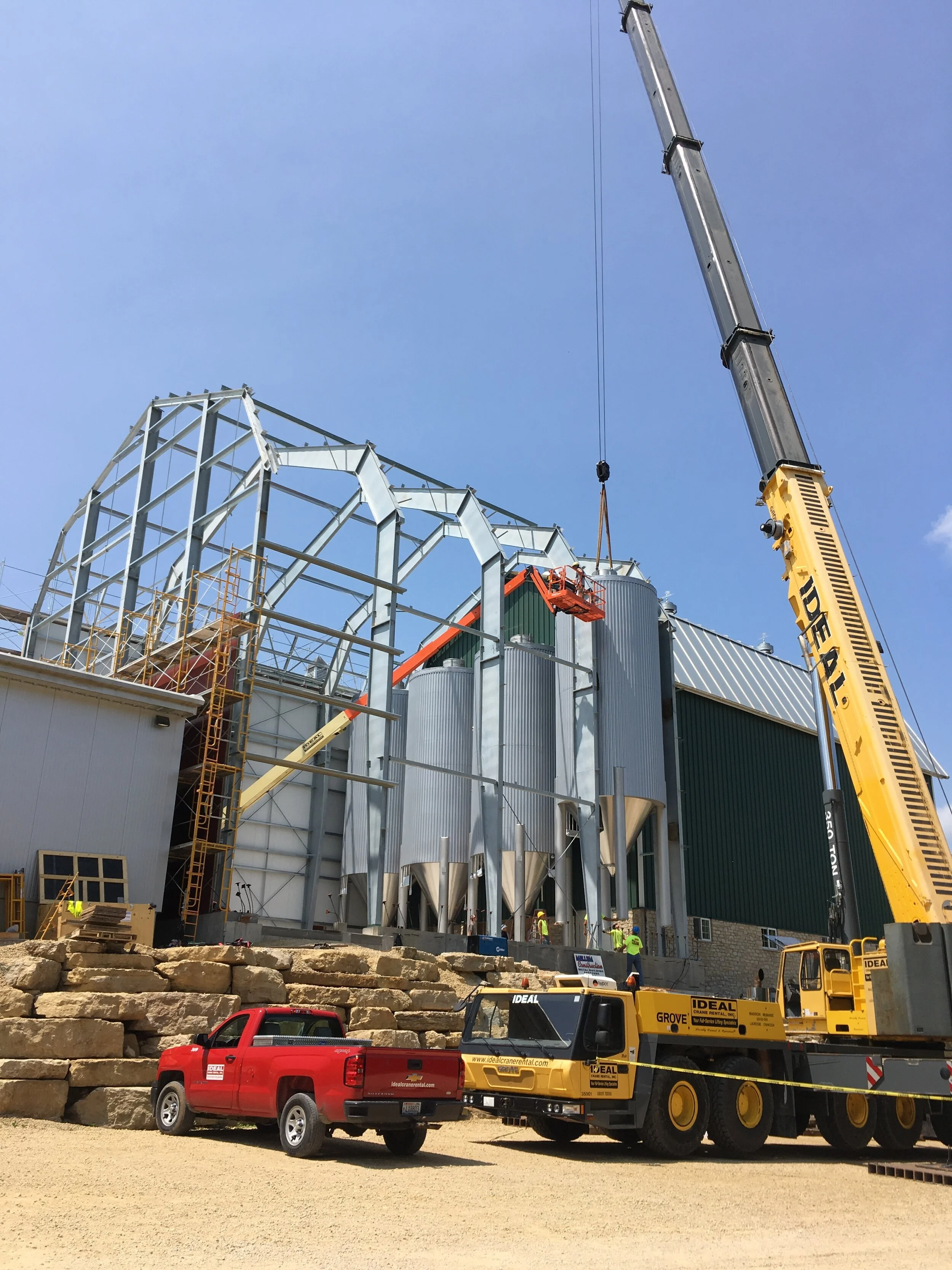 Project Objective: The New Glarus Brewing Co needed to expand their brewing cellar to keep up with growing capacity. They would need to fit 16 fermentation tanks, measuring roughly 14’ diameter by 44’ high, into an approximately 6,000 SQF site. The owners requested the design mimic their existing cellar, a metal building with traditional gambrel roof barn and a stone foundation.